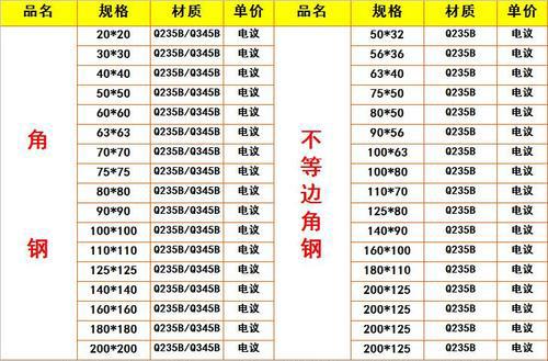 等邊角鋼規(guī)格型號產(chǎn)地規(guī)格型號產(chǎn)地25×25×2、3天津30×30×2、3天津40×40×3、4天津50×50×4、5安鋼、天津63×63×5、6安鋼、天津70×70×6、7安鋼、天津75×75×6、7、8安鋼、天津80×80×6、7、8安鋼、天津90×90×7、8、9鞍鋼、天津100×100×8、9、10鞍鋼、唐鋼110×11…